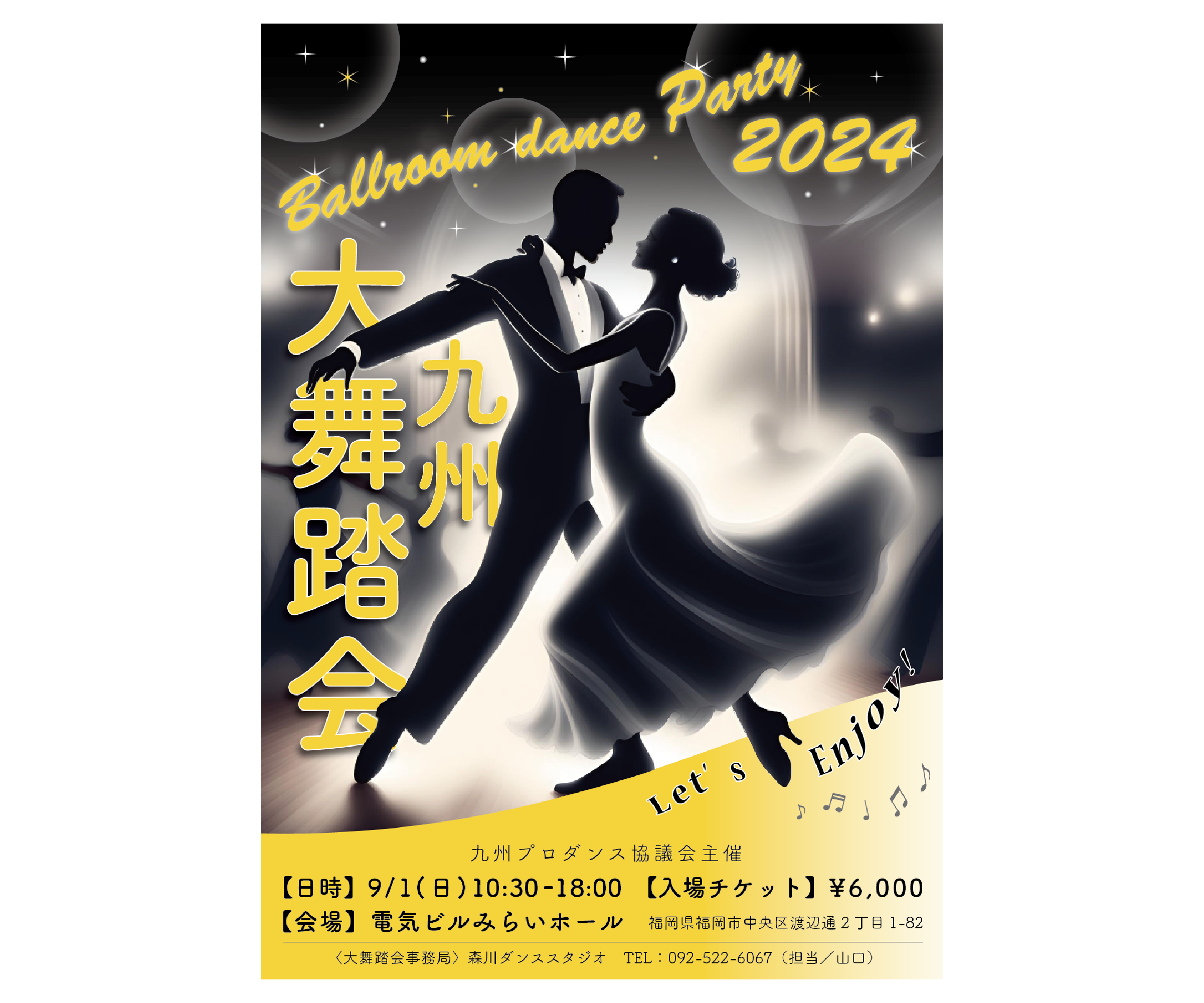 毎年のイベントで、年末のパーティに比べるとカジュアルなもの。社交ダンスの華やかさはありつつ、くだけた雰囲気にしました。人物のイラストは生成AIを使用しています。思うようにいかず難しいですが、使いこなしたいツールの一つです。